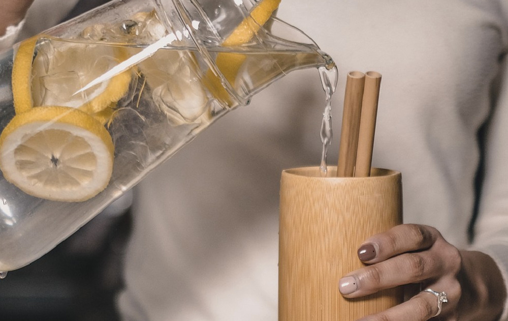 Bicchieri e cannucce in legno di bamboo da foreste rinnovabili. Il bamboo è resistente, naturalmente antibatterico e ipoallergenico.